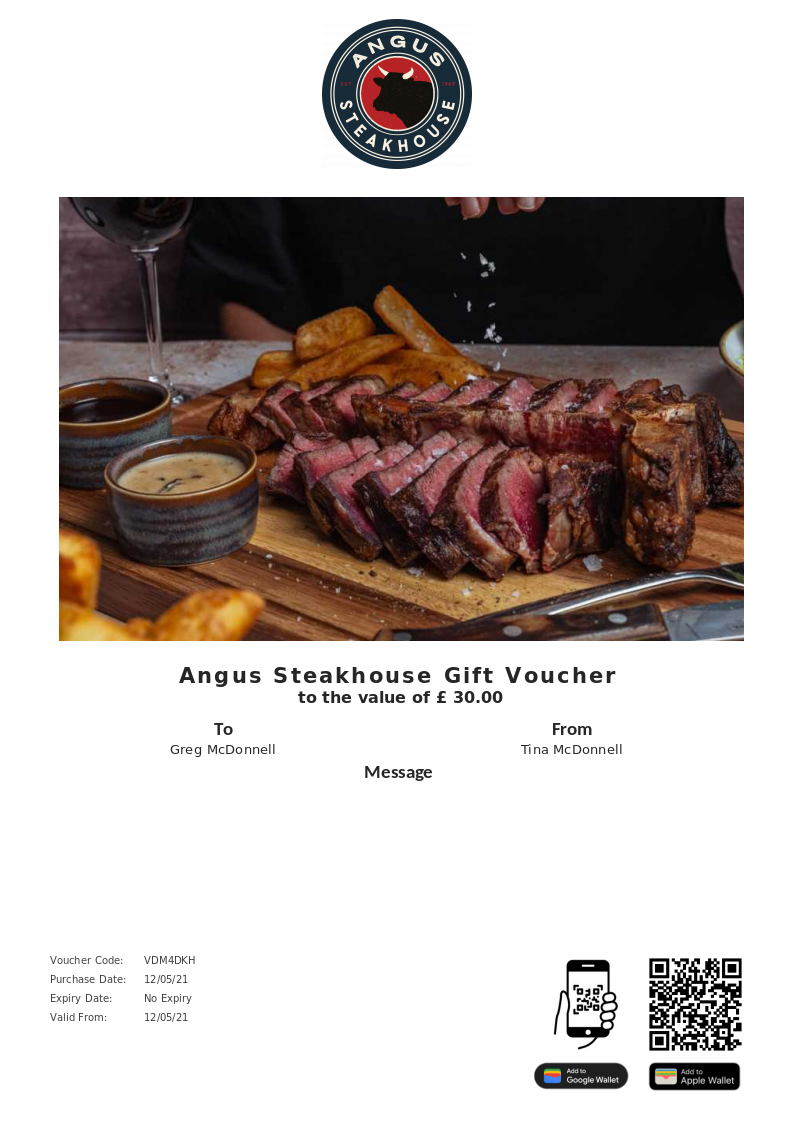 Angus Steakhouse allows you to purchase instantly printable gift vouchers, special offers and tickets using the Voucher Connect platform.